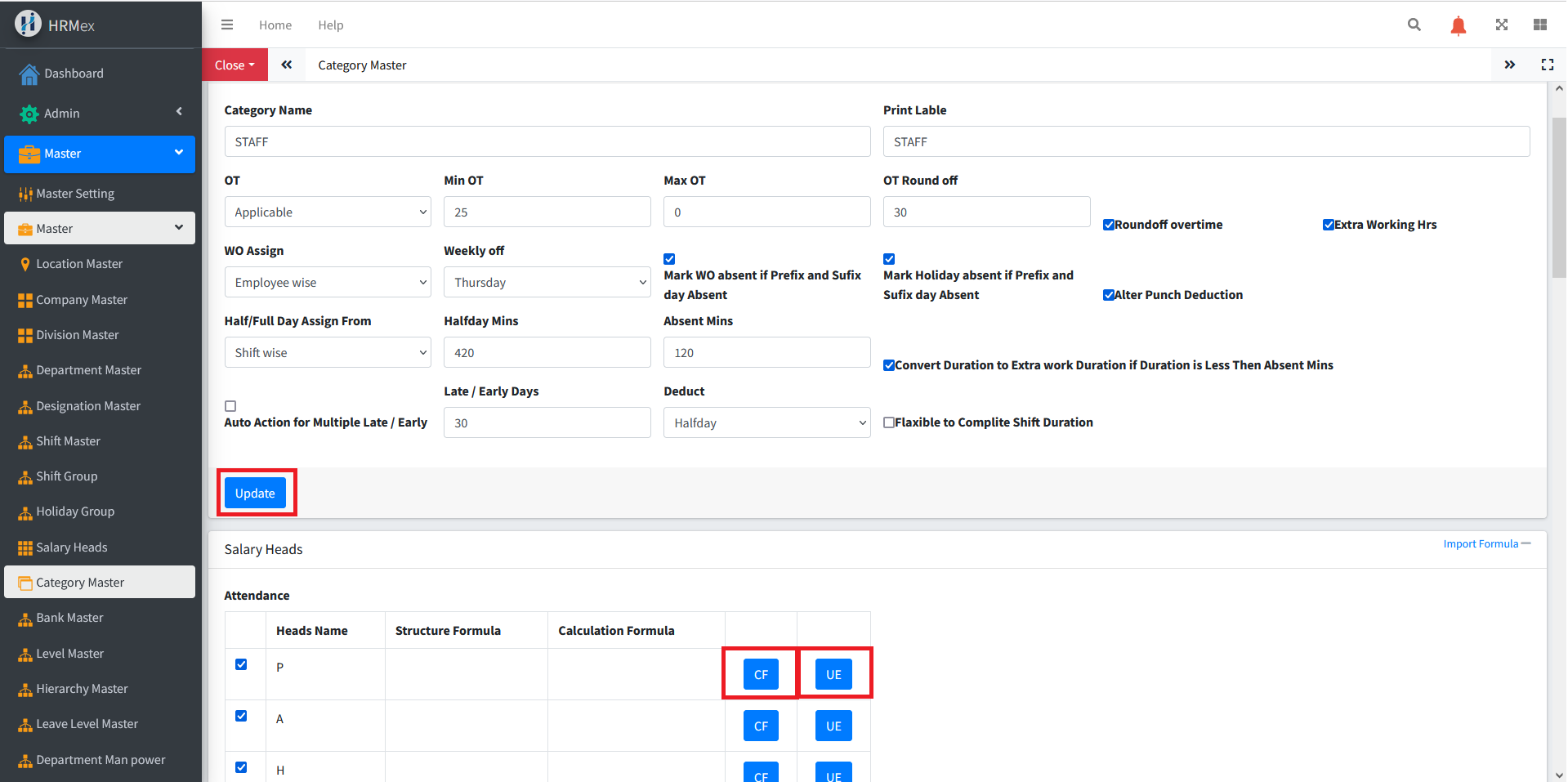 - Salary Head Formulas: Add new salary heads or update existing ones for the category. Use the "UE" button to add a new salary head, "CF" to set the formula, and "Check" to verify the syntax.