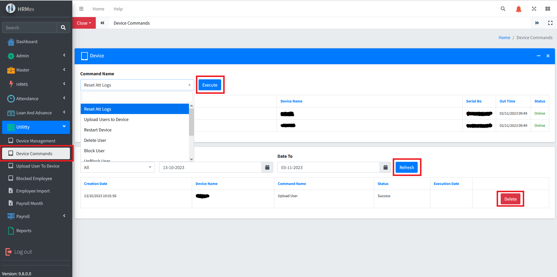 The "Device Commands" feature in HRMex Time and Attendance software, accessible from the "Utility" menu, is a powerful tool for performing various commands on registered devices. This feature allows users to view registered devices, execute commands, check the past log of device commands, and manage employee-related commands.