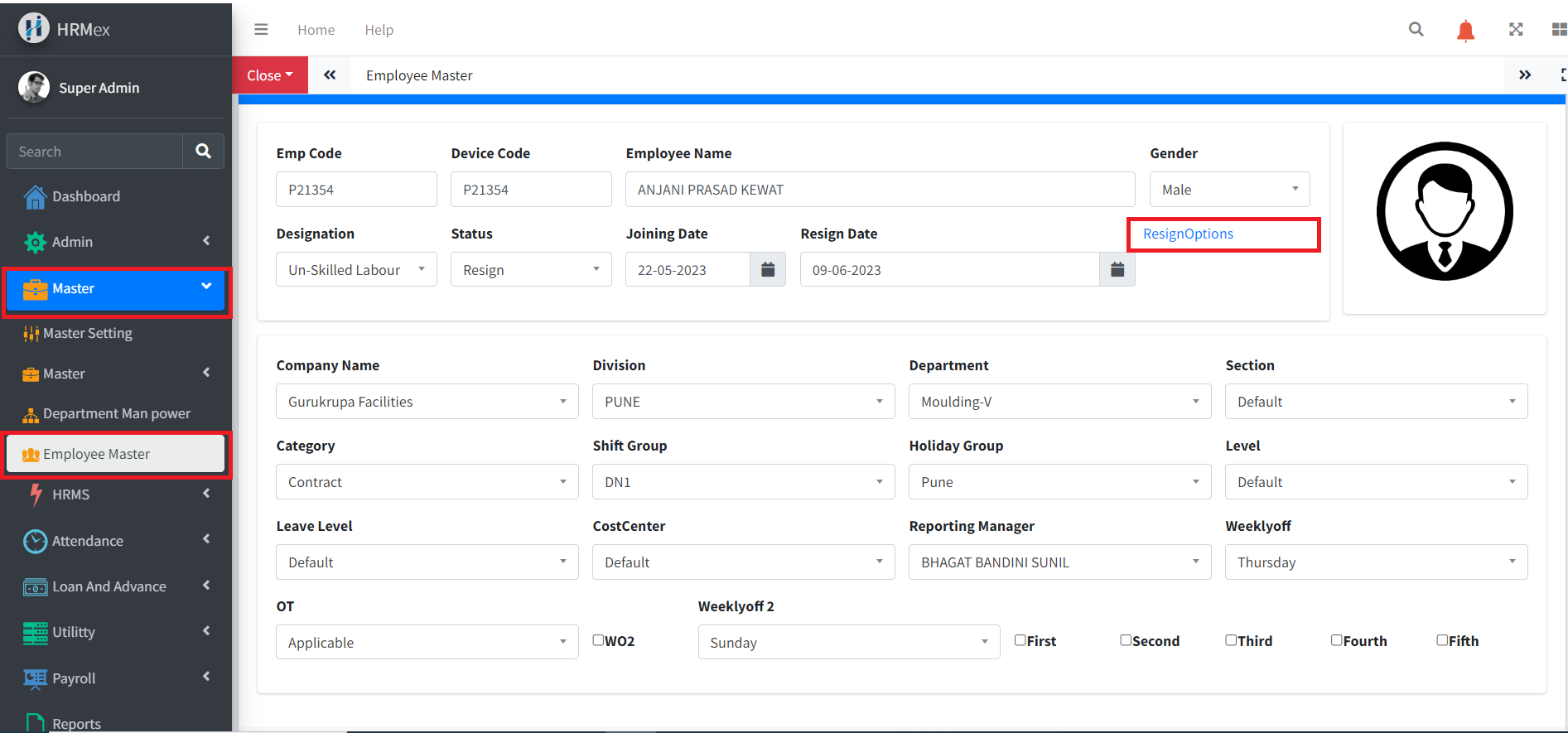 Initiate Resign Process: Within the employee edit options, find the Resign Option to initiate the resign process.