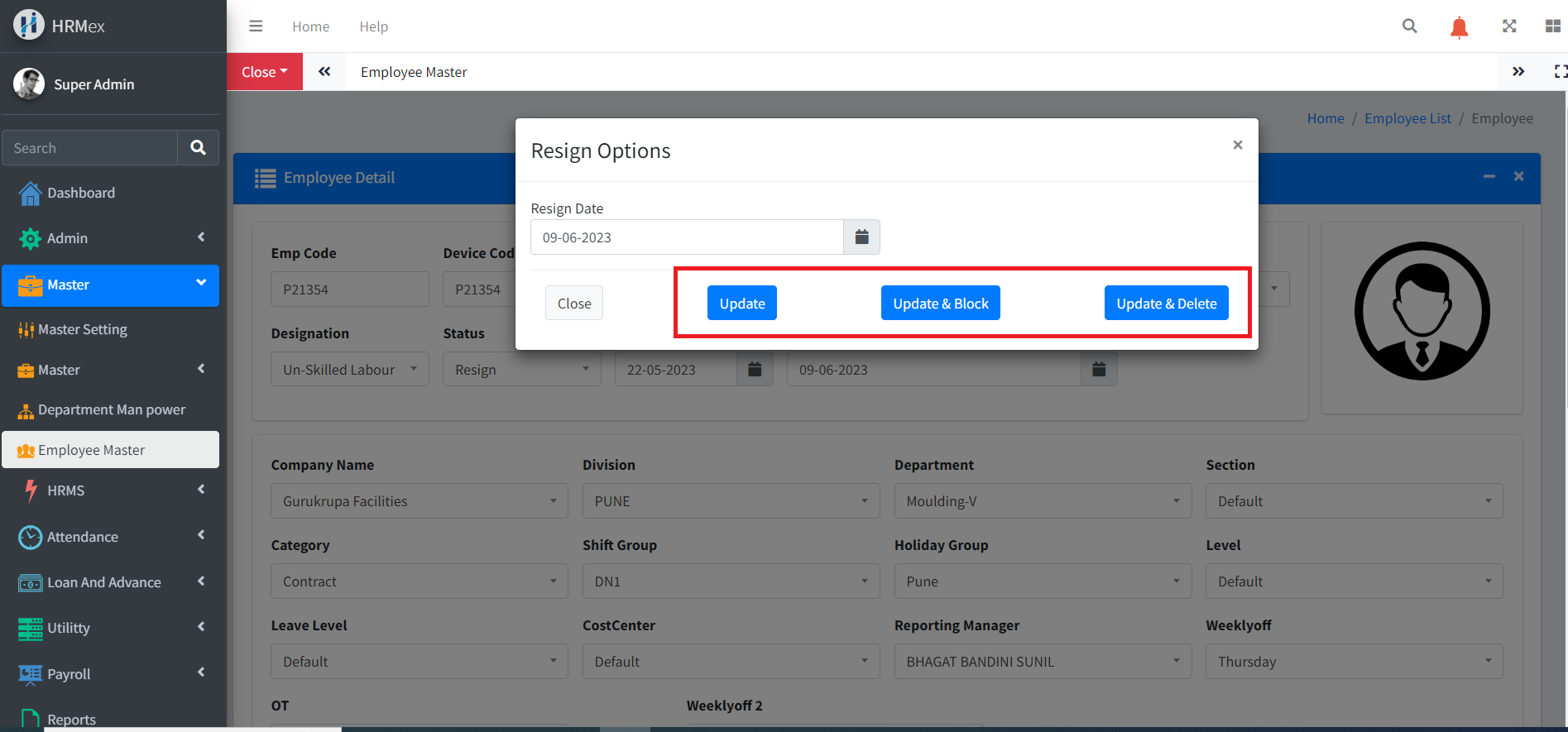 Update and Block Employee in Biometric: Choose this option to block the employee's access in the biometric system while retaining their data.
