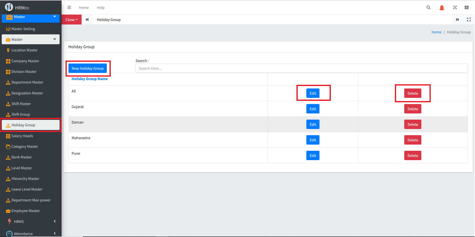 Delete Holiday Group: If you need to remove a holiday group from the records, use the "Delete" button. Select the holiday group record to be deleted and confirm the deletion.