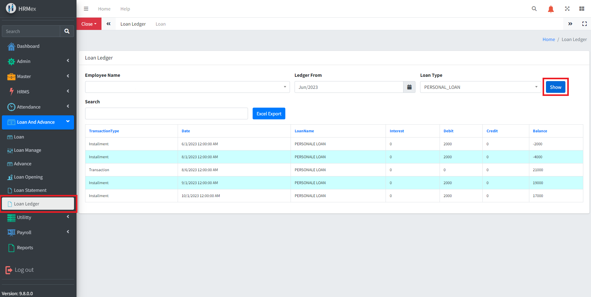 Click "Show": After selecting the employee name, date, and loan type, click the "Show" button to display the loan ledger. The ledger includes transaction type of loan, transaction date, loan type, interest, debit, credit, and the balance of the loan for the selected employee in a table format.