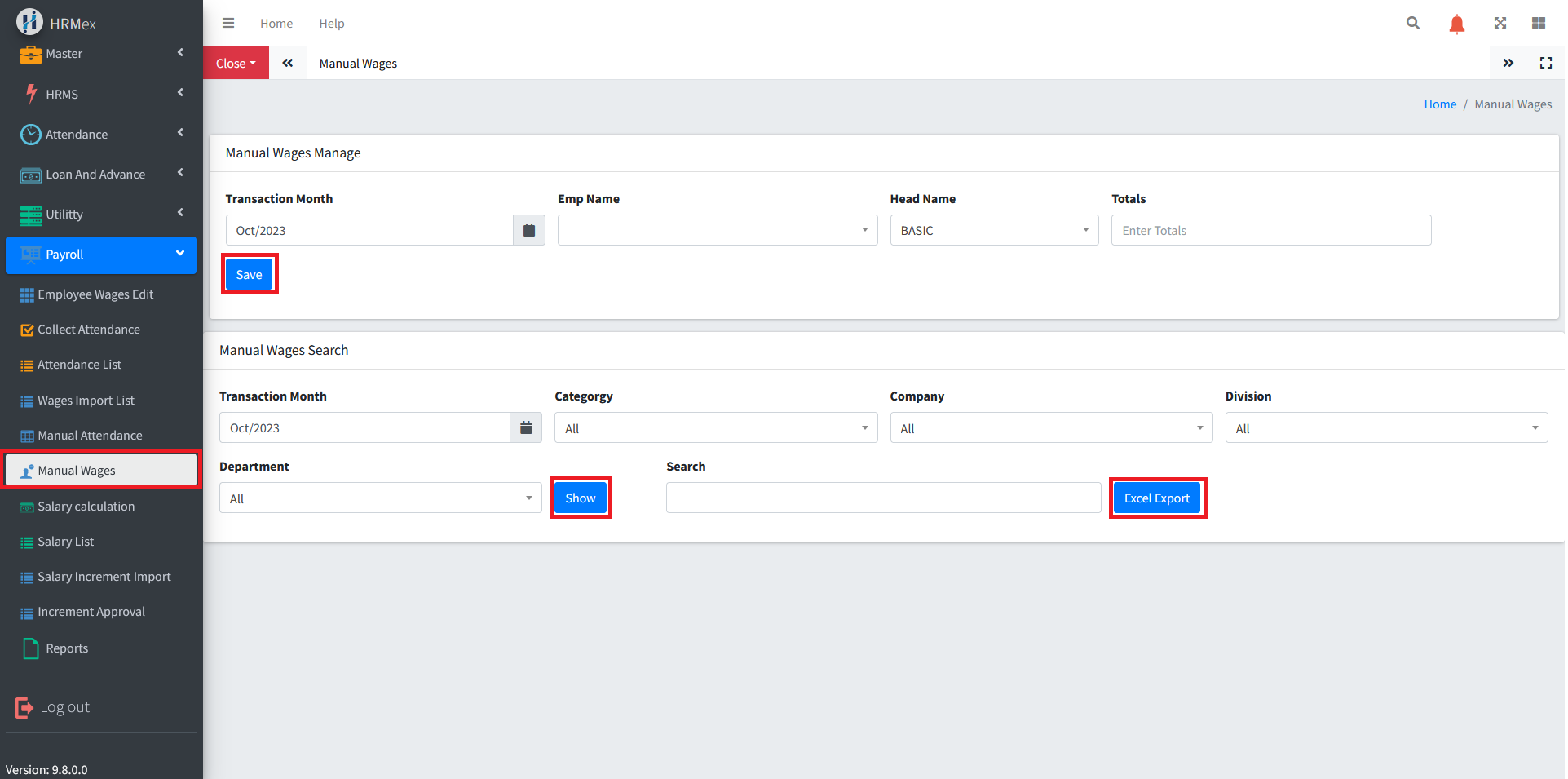 - Click "Excel Export": Next to the "Show" button, use the "Excel Export" button to export manual wage adjustment data into an Excel file for record-keeping or further processing.