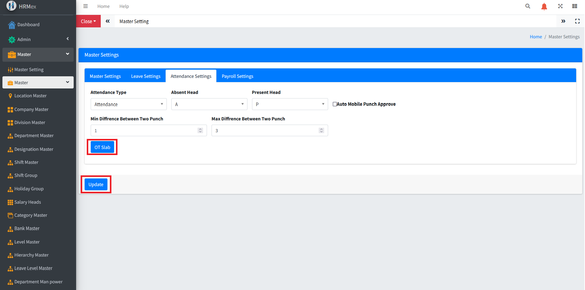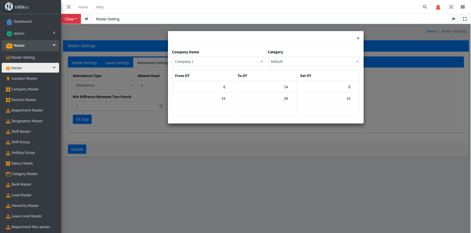 - OT Slab: Define overtime slabs to determine the compensation for overtime.