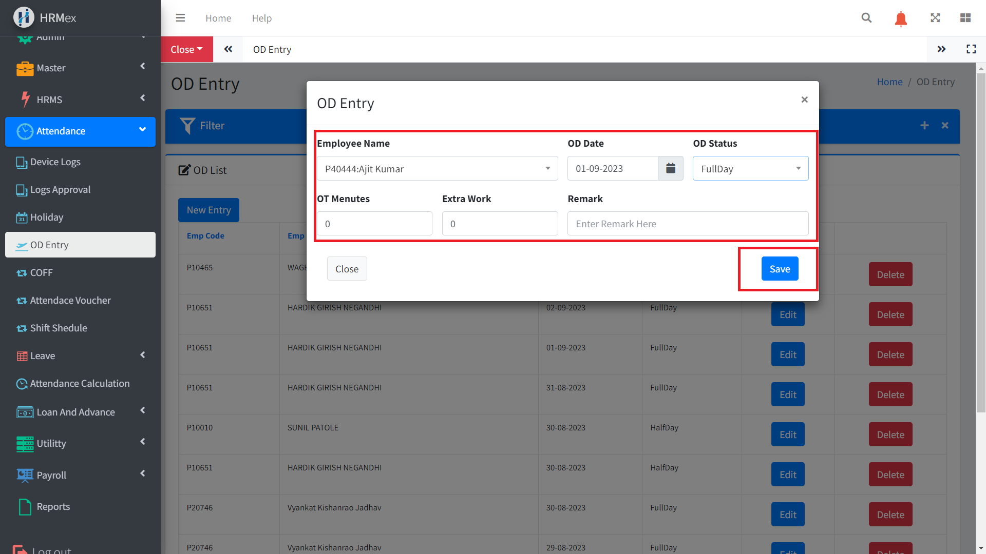 Save: After entering the required details, click the "Save" button to create the OD entry.