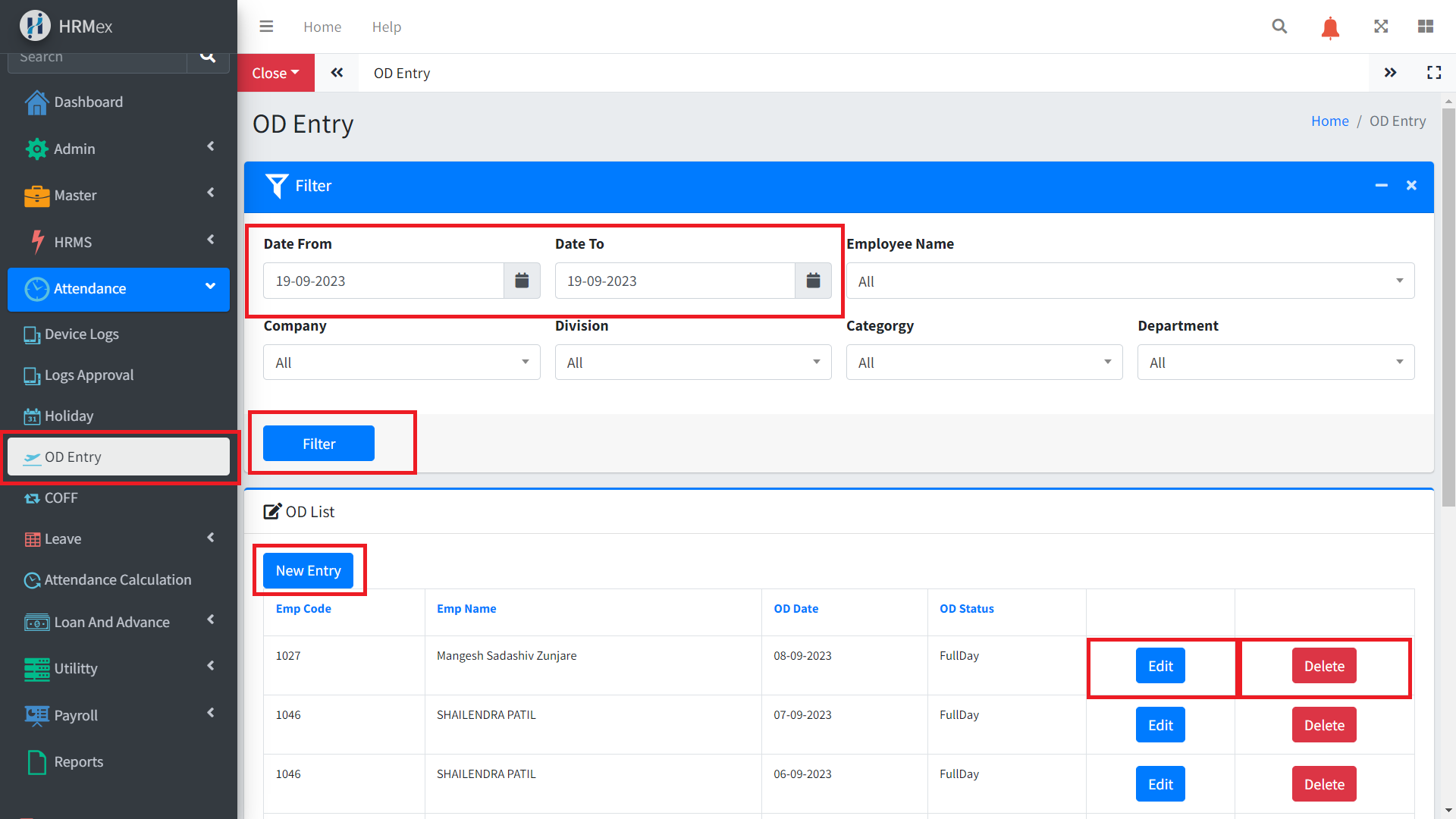 - Filtering: Use filters to view OD entries by employee name, company, or department, making it easy to find specific records.
