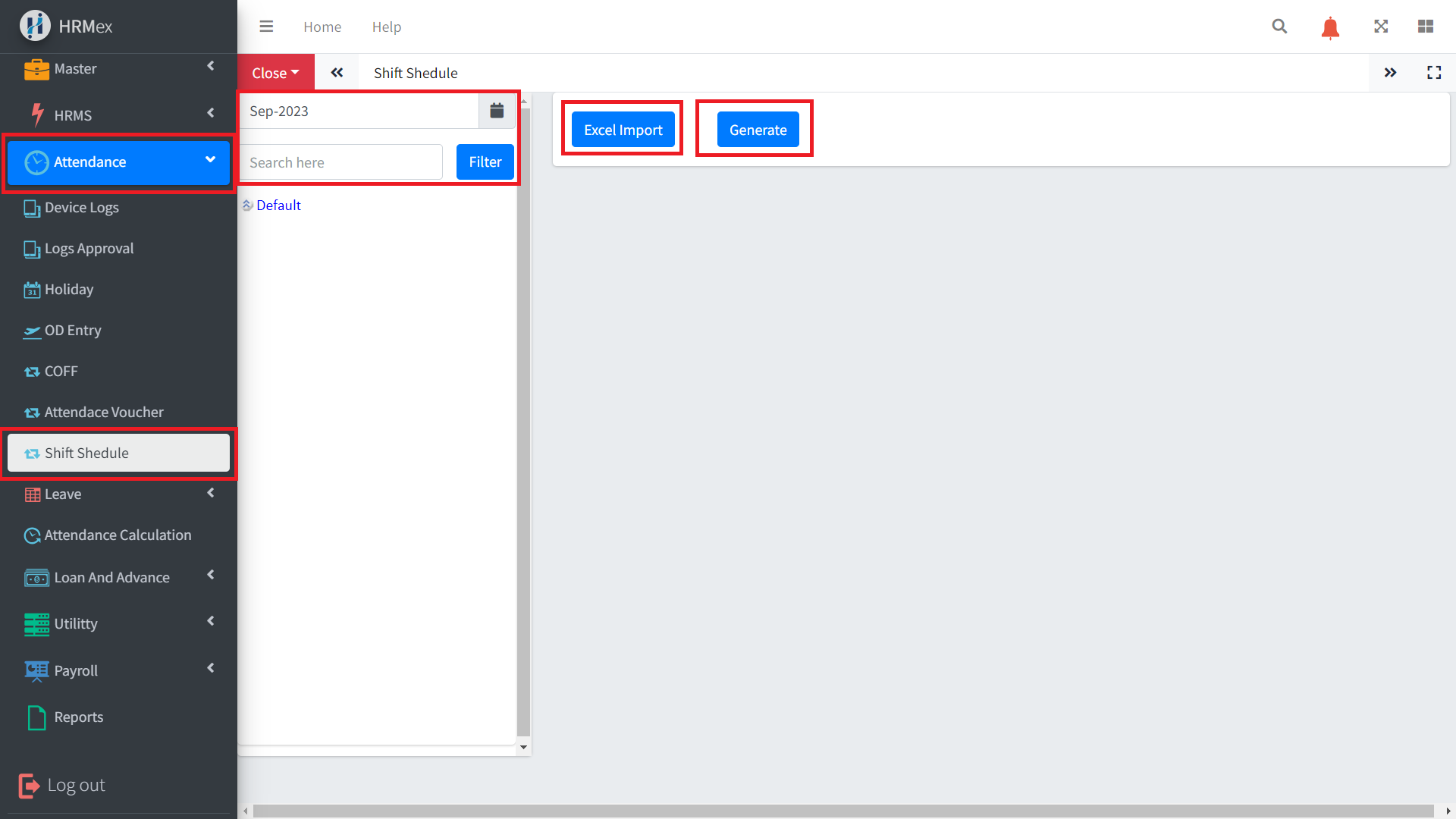 The Shift Schedule feature in HRMex Time Attendance Software provides a convenient and efficient way to manage employee shift schedules. This feature enables HR administrators and managers to create, view, and make changes to shift schedules for individual employees or groups. You can access the Shift Schedule section from the Attendance Navigation menu.